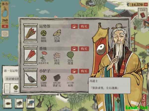 《江南百景图》小铲子获得途径跟老道士进行对话(这里才能买到小铲子) 小铲子获取: 本章节一共需要用到两个小铲子,所以现在先买了也不要紧。还有就是多砍点红牵牛花买香烛,好像是用到8个。