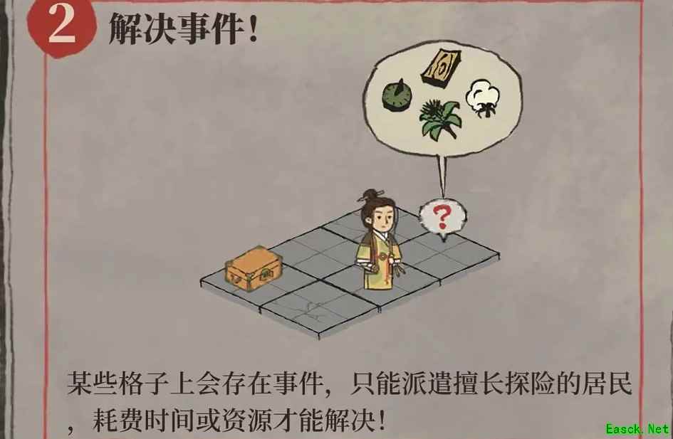 玩家在移动的时候,某些格子上会存在随机事件事件,这些事件会消耗玩家的物资或者时间,需要玩家派遣一些擅长探险的居民耗费时间或资源才能解决。