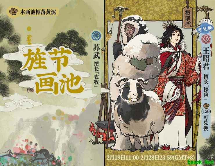 旌节画池UP时间: 2月19日11:00—2月28日23:59 画池详情: 本期为黄泥画池,天级居民【王昭君】、侯级居民【苏武】进入【旌节】画池。 活动期间天级居民【王昭君】、侯级居民【苏武】概率提升! 画池掉落黄泥,收集齐150黄泥,可直接兑换【王昭君】。 【黄泥】道具补充说明 大人们可通过黄泥画池抽卡、参与活动(新增)等方式获取【黄泥】。 【黄泥】积攒到一定数量,即可直接兑换黄泥活动卡池的指定角色,每个角色仅可兑换一次。