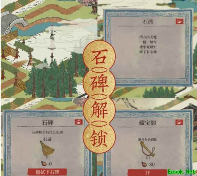 隐藏彩蛋 1、铜钱树,点击可获得铜钱。 2、体力泉水,点击可获得体力。解锁迷宫里迷雾遮挡的地图里就可以看到了。 3、灶王爷,在张择端厨房里。拜一拜可获得一个金卷轴。 4、藏宝阁。解锁石碑获得“脏兮兮的钥匙”后,来到迷雾迷宫的左上方那一块被迷雾遮挡的地方,点击迷雾就可以解锁,看到藏宝阁,点击藏宝阁就可以获得金卷轴和补天石。