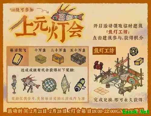 活动具体步骤 活动开启时,获得临时建筑【鱼灯工坊】; 摆放建筑并点击参与活动任务; 完成任务获得积分,可兑换奖励; 另外还可以在灯会放飞【孔明灯】; 全服每日放飞【孔明灯】达到十万、三十万、五十万时,即可在【灯会】界面领取额外奖励。