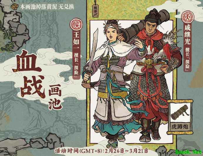 《江南百景图》血战画池内容介绍一、画池内容 天级居民【戚继光】及其专属珍宝【虎蹲炮】、侯级居民【王如一】进入【血战】画池。活动期间【戚继光】、【王如一】概率提升! 活动结束后【戚继光】、【王如一】进入【精英】画池。 二、上线时间 2月26日11:00—3月21日23:59