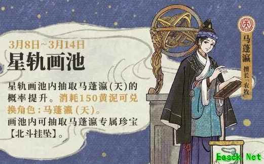 《江南百景图》3月黄泥卡池内容一览以下所有黄泥画池均可消耗150黄泥直接兑换相应的天级居民,并且可以抽取相应天级居民的专属珍宝。 3月8日11:00至3月14日23:59,【星轨画池】开启!天级居民【马蓬瀛】概率提升;