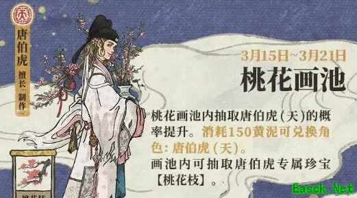 3月15日11:00至3月21日23:59,【桃花画池】开启!天级居民【唐伯虎】概率提升;