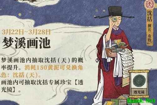 3月22日11:00至3月28日23:59,【梦溪画池】开启!天级居民【沈括】概率提升;