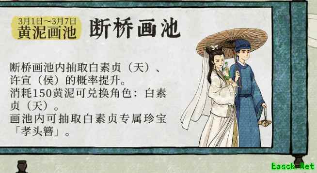 断桥画池活动介绍【活动时间】 3月1号——3月7号 【活动内容】 1、断桥画池内抽取白素贞(天)许宣(侯)的概率提升。 2、消耗150黄泥可兑换角色:白素贞(天)。 3、画池内可抽取白素贞专属珍宝「孝头簪」 。