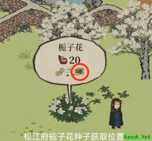 《江南百景图》栀子花种子获得方法1.栀子花种子砍旁边的栀子花就行 2.前往苏州府探险-阊门地图,[木炭摊]兑换也能获得