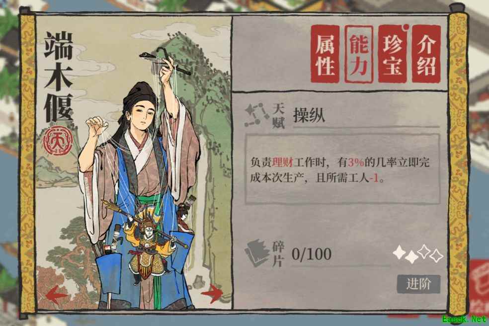 天赋效果: 端木偃擅长理财类工作,参与工作时立即完成; 天赋操纵: 负责理财工作时,有3%的几率立即完成本次生产,而且需要工人数量-1。 端木偃在理财方面的工作有比较突出的效果,喜欢的小伙伴可以抽取。