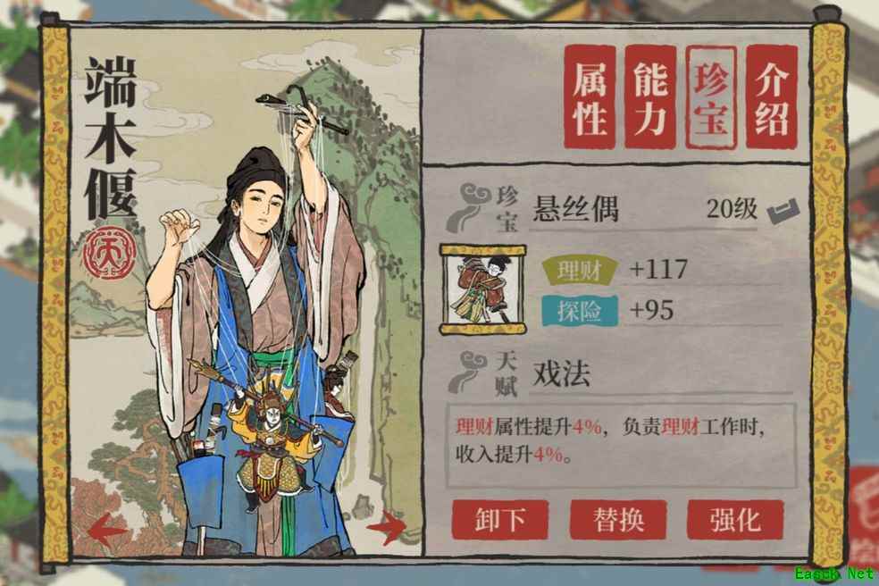 专属珍宝效果: 悬丝偶 理财+117 探险+95 天赋戏法 理财属性提升4%,负责理财工作时,收入提升4%。 以上就是《江南百景图》端木偃属性介绍的全部内容了,更多手游攻略请关注手游网! 本文内容来源于互联网,如有侵权请联系删除。 |