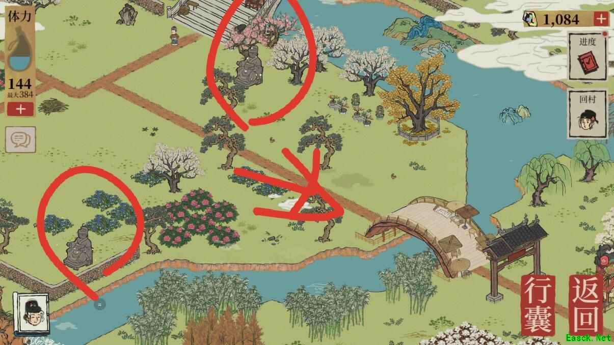 《江南百景图》用卦象让李宝家打开小树林卦象获取方式: 卦象从桥边的两个灶王爷雕像处获得,点击这两个灶王爷即可得到两个卦象;