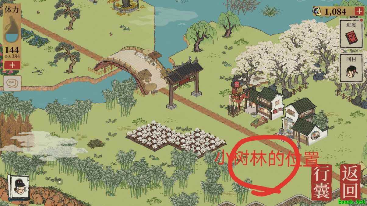 李宝家的位置: 李宝家的就是桥边这个小人,把卦象给他即可驱散迷雾,进入小树林。