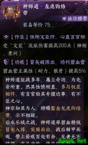 《逆水寒手游》流沙试炼独珍装备介绍详细内容 推荐职业:血河、铁衣 一、种师道·龙虎钩络带 1、属性:遭受文臣的攻击时伤害提升200点,自身主属性提高百分之五。