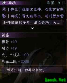 2、词条:根骨、耐力加19,火属性和土属性攻击加99,气血上限加2066。