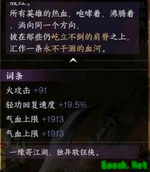 2、词条:火属性攻击加91、轻功回复速度加19.5%、气血上限加1913。