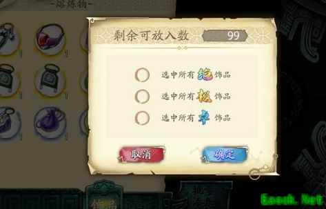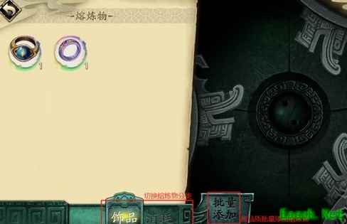 三、饰品熔炼 1、批量添加:点击右侧批量添加按钮,可直接选中稀有度(卓、极、绝)相同的所有饰品,上限为99。 2、奖励:熔炼卓品饰品可获得「铜钱」,熔炼绝品饰品可获得「泫露」,熔炼极品饰品可获得绝品「御-太玄石」。