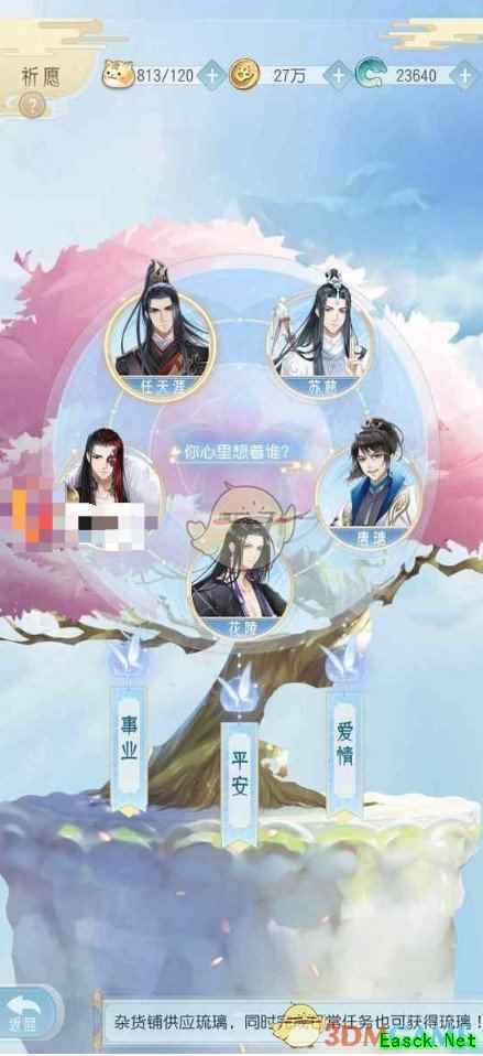 问缘玩法介绍: 祈愿: 祈愿自然是祈求美好姻缘,有事业、平安、爱情这3个方面可以进行祈愿。通过祈愿我们可以得到姻缘雀的专属批注,并且还能提升自己与祈愿对象的好感度。因此,想要提升哪位男主的好感度,就可以选择他作为祈愿对象,随着祈愿的完成,自己与对方的好感度也将一并提升。