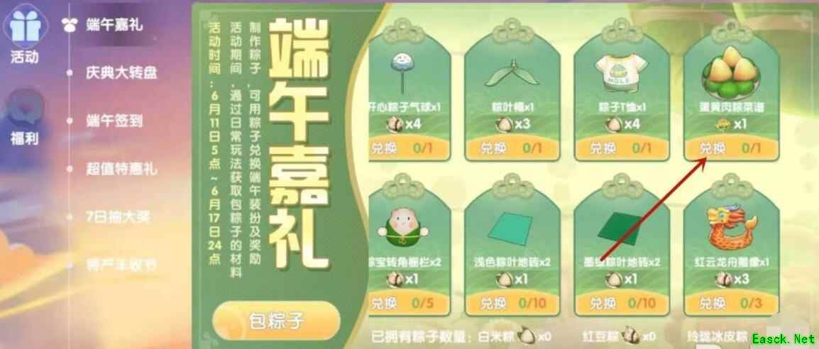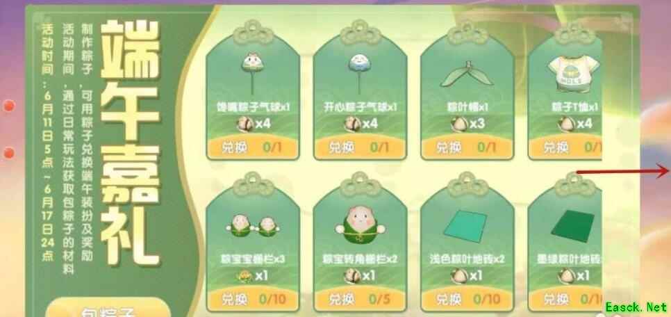 游戏中大家可以在6月11-17日用粽子兑换开心粽子气球、粽叶包、粽子T恤、蛋黄肉粽菜谱、粽宝转角栅栏、浅色粽叶地砖、墨绿粽叶地砖、红云龙舟雕像等奖励。
