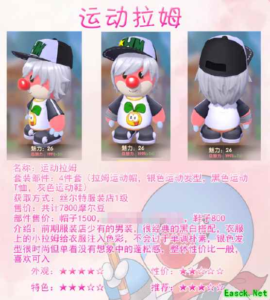 介绍:前期服装店少有的男装,很经典的黑白搭配,衣服上的小拉姆给衣服注入色彩,不会过于单调朴素,银色发型很时尚但单看没有想象中的蓬松感,整体性价比一般,喜欢可入