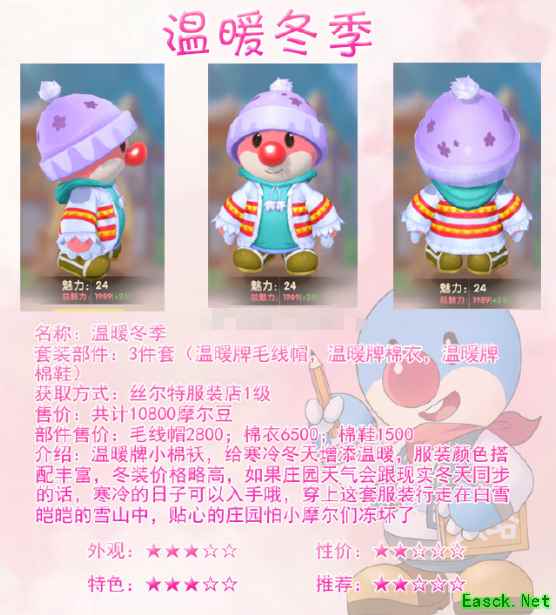 介绍:温暖牌小棉袄,给寒冷冬天增添温暖,服装颜色搭配丰富,冬装价格略高,如果庄园天气会跟现实冬天同步的话,寒冷的日子可以入手哦,穿上这套服装行走在白雪皑皑的雪山中,贴心的庄园怕小摩尔们冻坏了