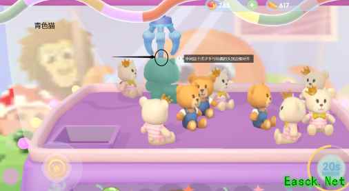 中间的爪子手与玩偶的头顶边缘对齐。对齐后,摁下抓取,就可以直接抓到青色猫了,如果一次不行,你多试几次,是一定能抓到的。