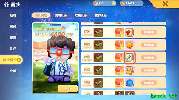 在商店的成长基金中,完成指定的任务就可以领取含有怪怪糖豆的奖励,前提是花费98元购买成长基金,否则只能领取金豆奖励,分别从成长奖励-7级/19级可领取到30份、收集任务-收集一套装备获得10份。