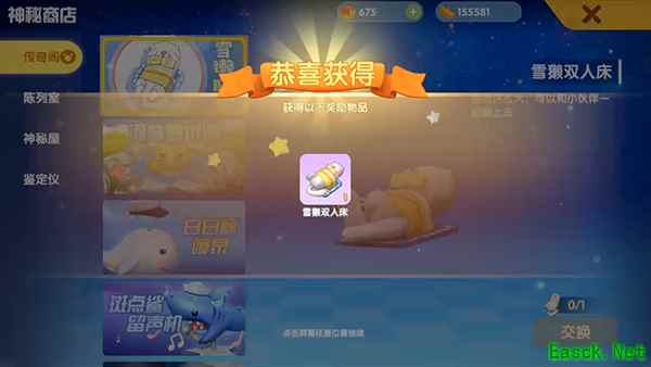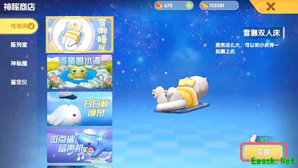 6.在传奇阁中点击【雪獭双人床】,然后点击右下角的【交换】;