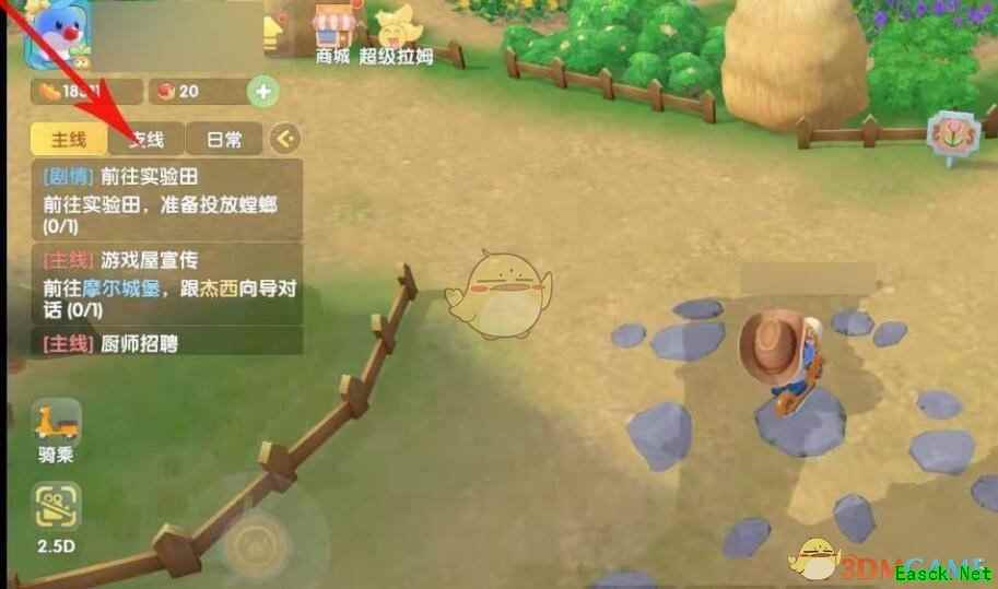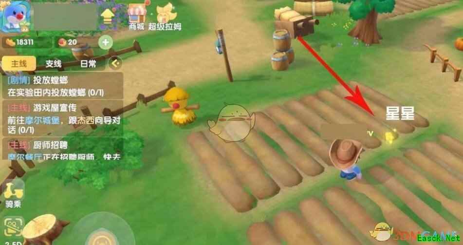 3、在农田找到星星图标,点击右下角白色手指按钮,即可完成前往实验田投放螳螂任务。