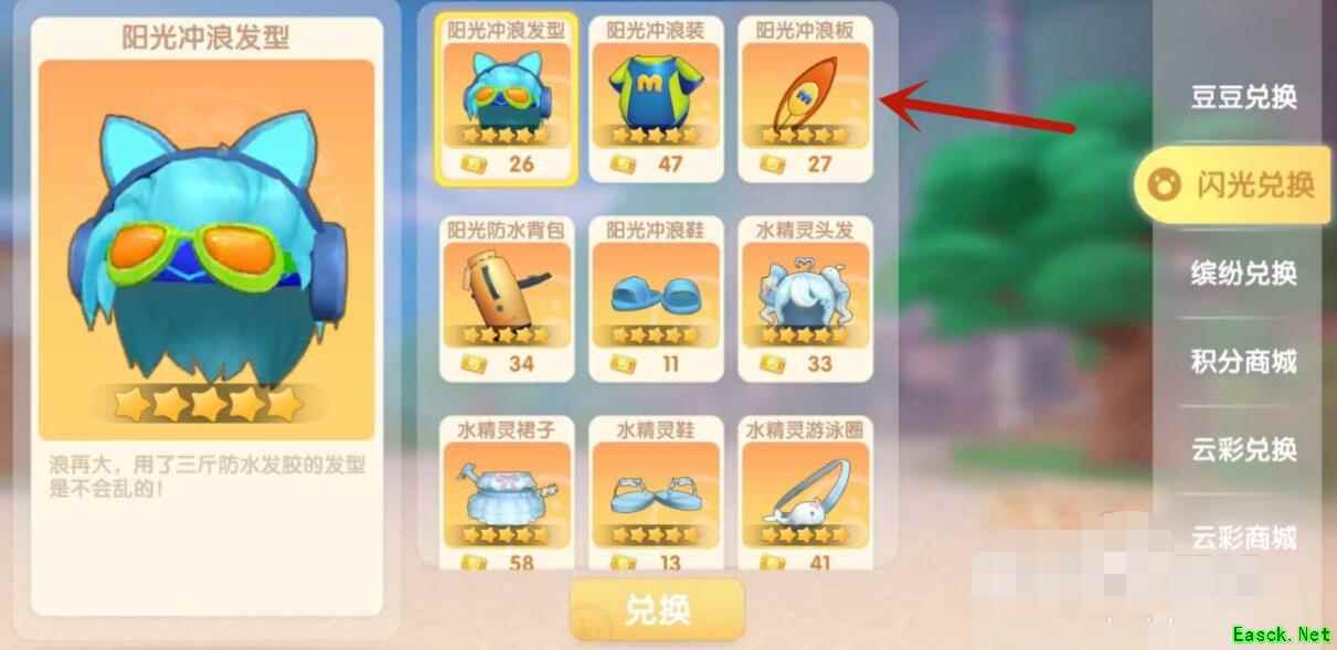 1、点击进入游戏,在右上角,点击扭蛋机;2、点击兑换;3、点击闪光兑换;4、消耗道具即可兑换获得阳光冲浪板。