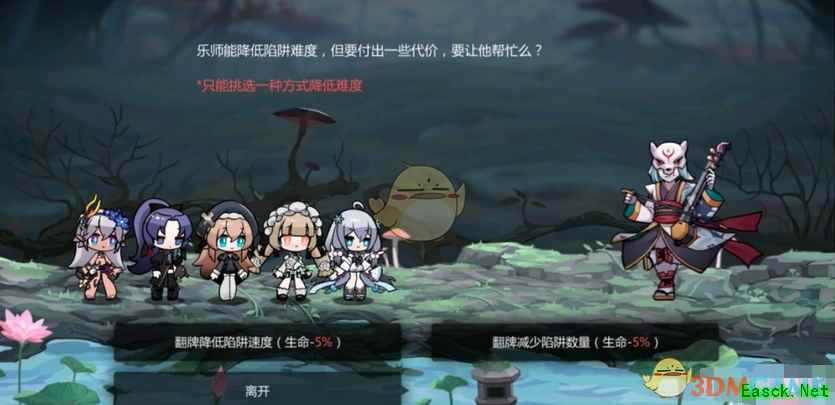 5、琴弓:自己选择一种方式降低难度,玩一次扣自己队伍5%的生命,建议选择翻牌减少陷阱数量,只能减少一次。