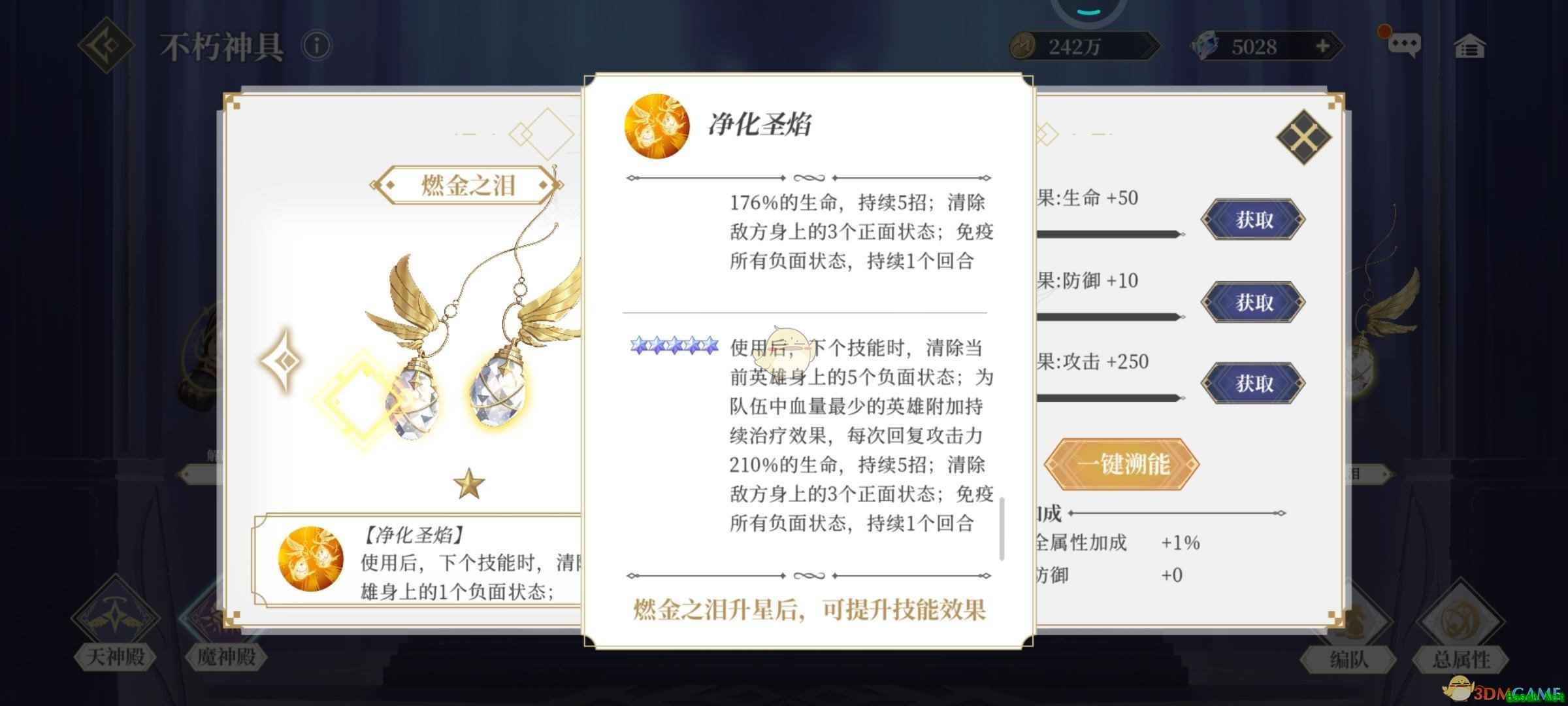 2星起步,使用后额外为队伍中血量最少的英雄附加持续治疗效果,每次回复攻击力75%的生命,持续5招;