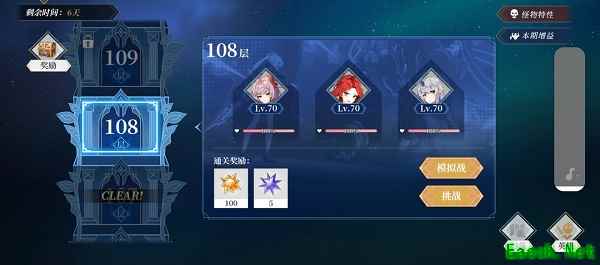 6、一众工具人(100层夏瓦尔):90层,100层的怪物伤害防御都很高,这时候就需要送两个工具人来触发爱缇欧的被动,保证伤害。