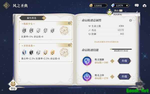 2、以上分别对应三个法典的高级属性,加的战力最多,提升最大,必须优先点,即伤加,减伤,命中,闪避,暴击与抗爆,点完后,从右边红色法典开始加起,筛选职业属性——御四灭四,提升战力值排第二位