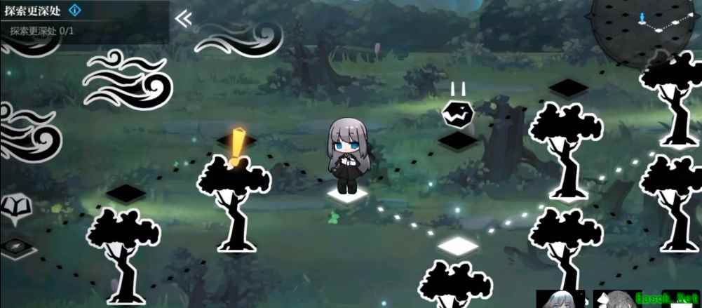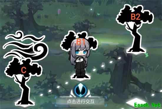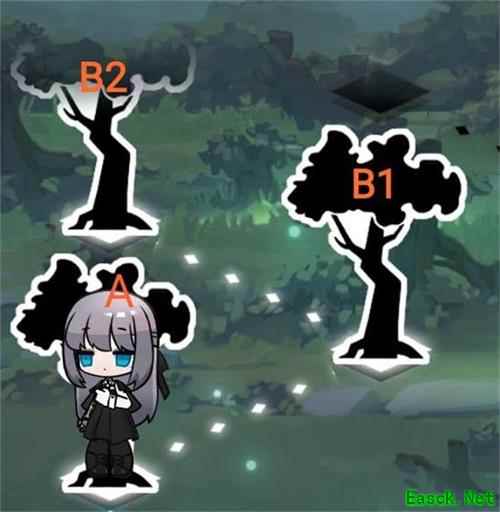 玩家在一开始到达的三个树木分别命名为A、B1、B2,玩家需要走一格到达B1位置交互,交互后会传送到下一个树木迷宫。