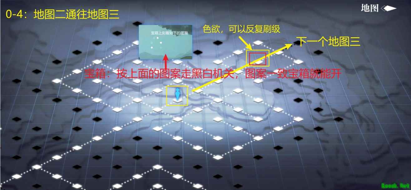 任务名称——封印的宝箱:我们需要将如图所示的地板按钮依照宝箱上的图案一一对应,在将其的黑白面相互对应即可解锁宝箱。