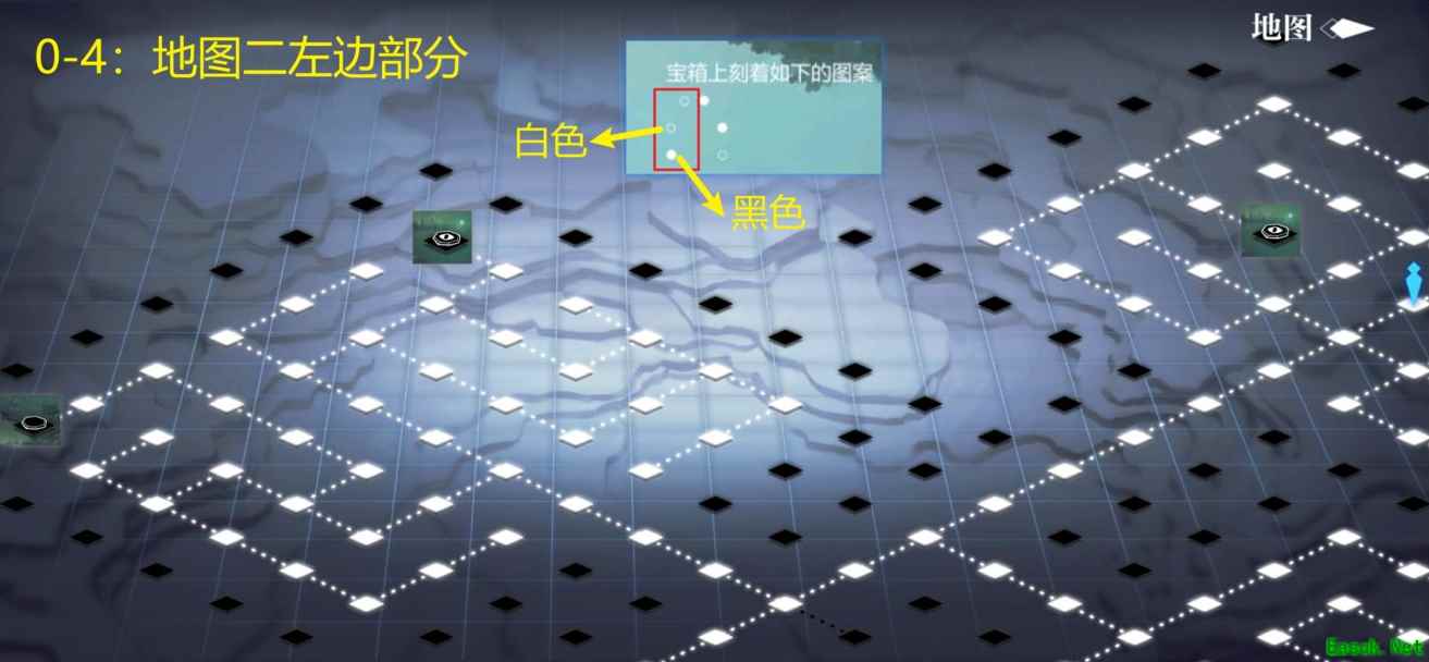 宝箱的提示分为两个部分,和地图的左右部分相对应,白色的点即为猫眼机关,白色的点即为纯黑色的机关。