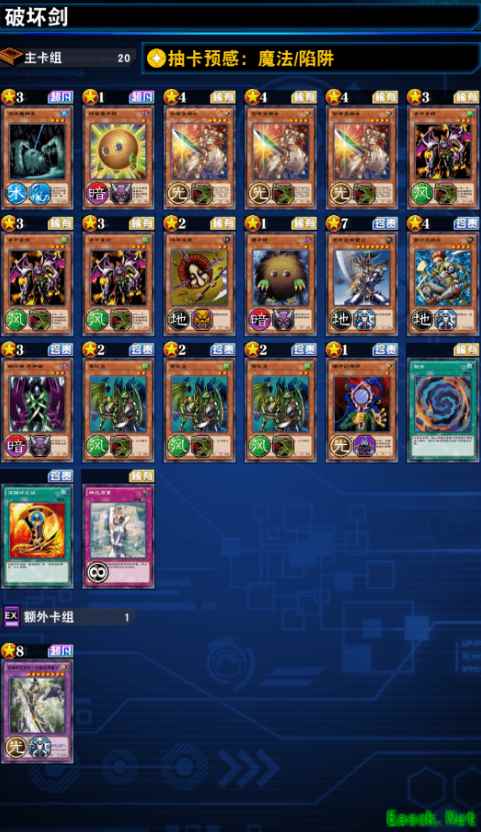 思路:用暗游戏的技能找这3张魔法陷阱卡,拉出破坏剑对面就打不过来,还有陷阱卡回血抗boss技能,其他全部放龙族怪兽卡做素材和一点苟命怪兽卡。