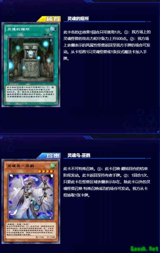 召唤风属性的灵魂怪兽「灵魂鸟-巫鹤」,回合结束阶段,灵魂怪兽要回到手牌,由此触发「灵魂的据所」的效果:我方场上的风属性怪兽回到手牌的场合,可将卡组的灵魂怪兽或仪式魔法卡加入手牌,将仪式召唤与灵魂怪兽连接起来。