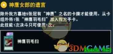 掉落技能,神鹰卡组必备的技能。不过由于是削弱的版本,不是上来就开,所以只是保证下一抽有。由于炸魔陷效果是必发的,所以先攻开这个卡也没有什么意义,反而会把自己炸了。