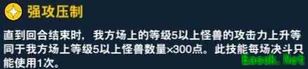 4级奖励,在低分段比较好用的技能。不过由于目前游戏内的强攻压制是旧版的,没有决斗中一次的限制,所以在高分段被完全取代了。优点是可以让创世龙骑士有2000攻,缺点就是双方都加攻。