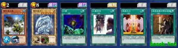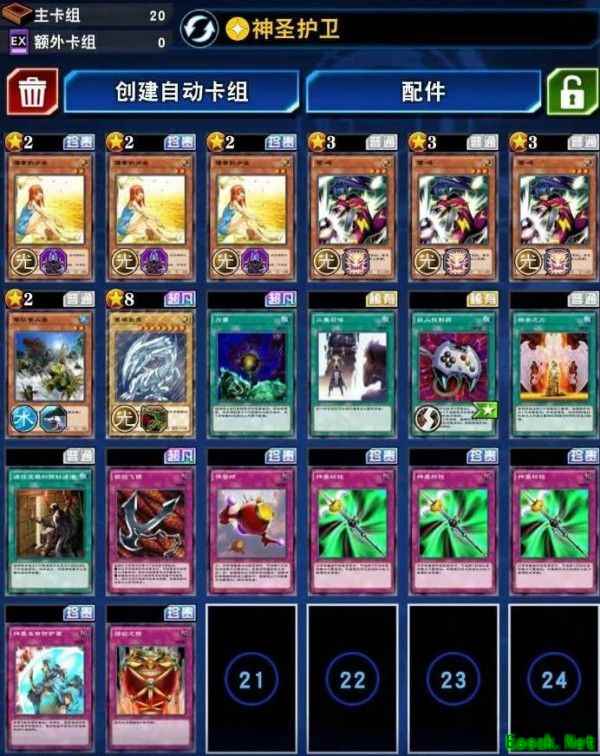 保命配件可以根据大家的牌库和喜好随意添加8张即可,图中为部分可选的牌池,无非就是扭防或者回血,以便在开局没抽到少女或者对方场攻可以斩杀的时候拿来救场。这里推荐大家用天梯R券换几张【神圣生命防护罩】,面对海马或者利息德这种可以把少女扭防的敌人也不虚。当然面对一些简单的敌人时,也可以换成加速过牌的单卡来提高刷分效率。或者在决斗得分差一两百分就多一个宝箱的时候,带一两张闪卡来增加一个宝箱