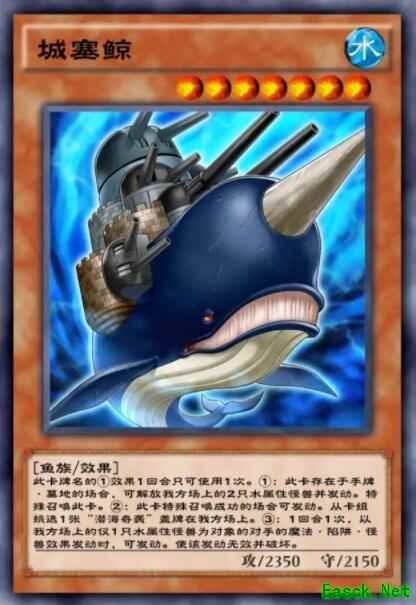 城塞鲸又称水属性机甲要塞,有着解放场上两只水属性怪兽特召并检索潜海奇袭的能力,一回合一次还可以提供针对水属性怪兽的取对象抗性。而潜海奇袭则可以通过除外水属性怪兽来保证魔法陷阱不被破坏,并为等级五以上的水属性怪兽提供不取对象的破坏抗性效果,两者携手可谓攻防一体。