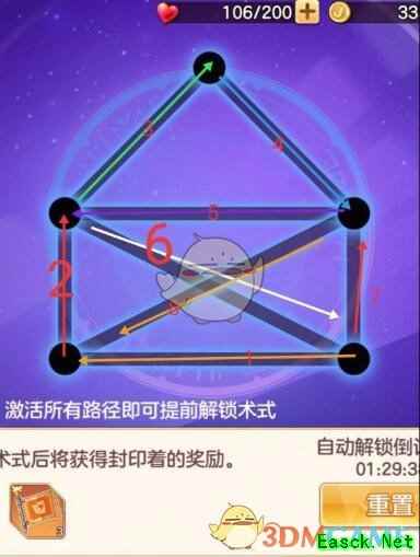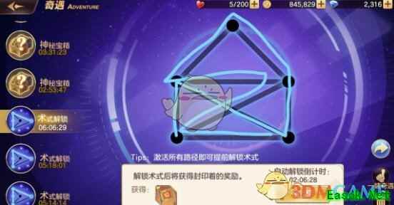 进入游戏主页面点击右侧【冒险】,在战斗过程中会随机遇到【奇遇】,其中就包括术式解锁。术式解锁的原理是,一笔连完所有线段,连过的线段不可再次连接,连接线段过程中通过的节点可以再次通过。大家根据术式解锁的原理进行解锁即可。摸到窍门,非常的简单,第一种找三角形画,第二种画大框。