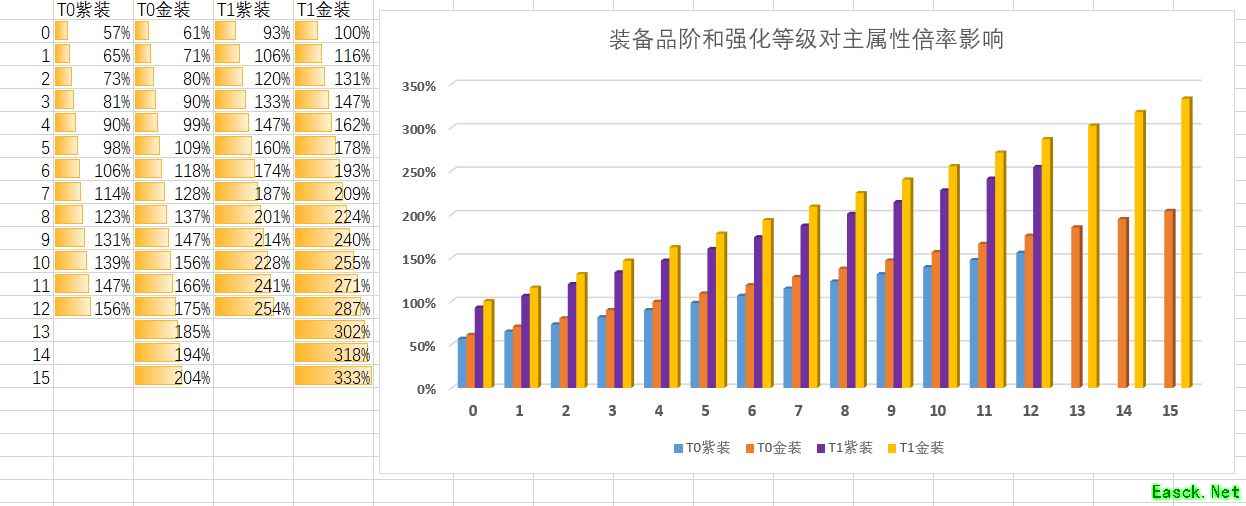 每个强化等级提升的属性值均等,金装用15个强化等级提升233%,紫装用12个强化等级提升175%