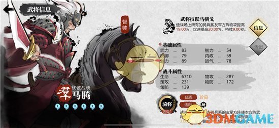 一流的骑兵武将,骑兵光环队的大核心,唯一缺点就是面板偏低。