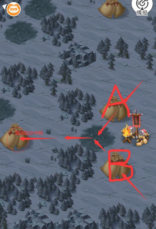 4、右下郓哥证词,首先推沙袋到右下,然后推沙袋到右,清完怪,此时有两个沙袋记为A和B,推一个出去左边树环绕一圈的中间,然后推另一个到右边泥潭清完怪,拿到证词。