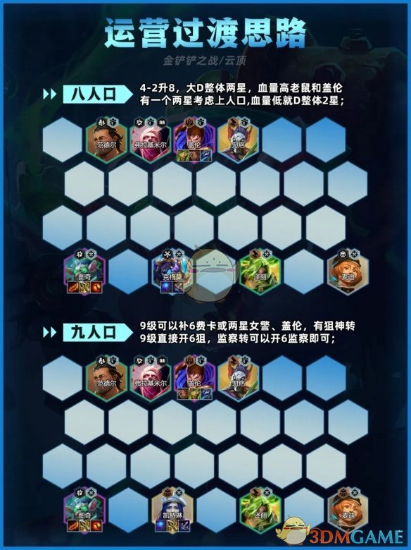 前期推荐用德莱文或麦迪搭配监察过渡,质量高2-1拉4,2-5拉5打连胜质量低就先不拉人口等质量补起来再转连胜。3-2拉6补充羁绊不d牌,留监察和狙神基础牌。