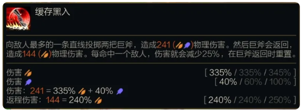 每命中一个敌人,伤害就会减少25%,在巨斧返回时重置。