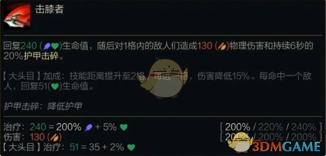 回复(200%/220%/240%法术强度+5%最大生命值)生命值,随后对1格内的敌人们造成(200%攻击力)物理伤害和持续6秒的20%护甲击碎。