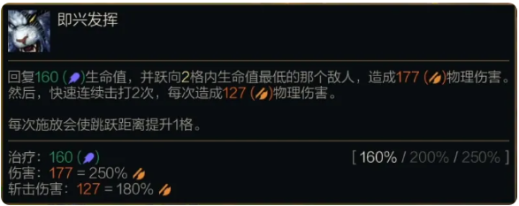 回复(160%/200%/250%法术强度)生命值,并跃向2格内生命值最低的那个敌人,造成(250%攻击力)物理伤害。然后,快速连续击打2次,每次造成(180%攻击力)物理伤害。