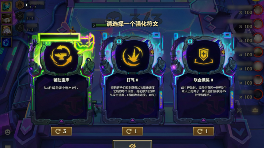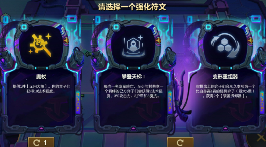 强化符文的黑客攻击是赛博城市中的一大亮点。黑客通过改变强化符文的选择和数量,为弈士们提供了前所未有的选择自由。你可能会在最初的强化符文格里,看到一些看似熟悉的符文,但随着回合的推进,这些符文的种类会逐渐丰富,甚至出现一些随机的变化。这种重随机制让你的强化符文选择不再单调,可以根据局势灵活应对,充分调动你的策略潜力。